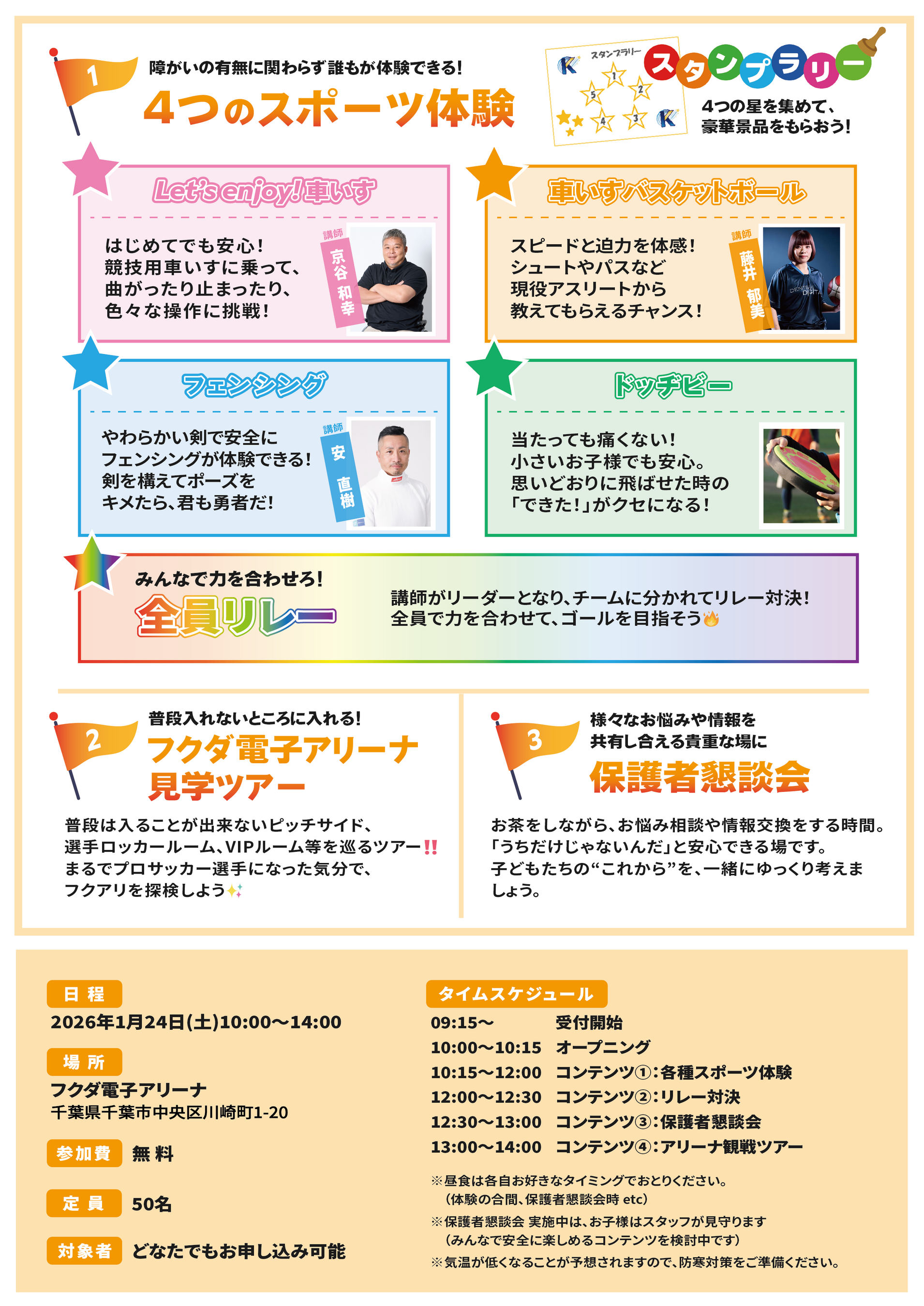 フクダ電子アリーナを一周しながら、4つのスポーツに挑戦!各ブースで星を集めて、豪華プレゼントをゲットしよう。