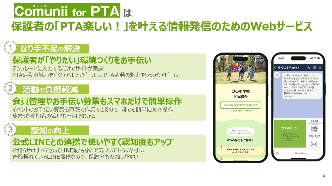 「Comunii for PTA」は、「PTA活動をもっと楽しく、負担なく」を、スマホさえあれば誰でも実現できる、PTA支援サービスです。[画像2: https://prcdn.freetls.fastly.net/release_image/166021/6/166021-6-211cb945ce9bd63f6acfd52056c3f23d-1920x1102.png?width=536&quality=85%2C75&format=jpeg&auto=webp&fit=bounds&bg-color=fff ]