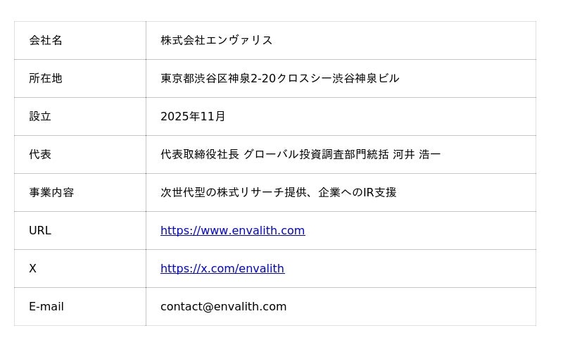 次世代型の株式リサーチ・プラットフォームを展開する株式会社エンヴァリス(本社:東京都渋谷区、代表取締役:河井浩一、以下「当社」)は、松井証券株式会社(本社:東京都千代田区、代表取締役社長:和里田 聰、証券コード:8628、以下「松井証券」)のリサーチ・カバレッジを開始することをお知らせいたします。