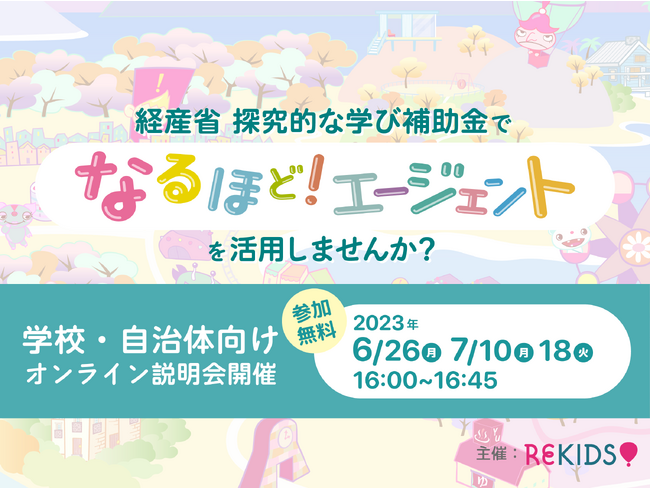 小・中学生のための探究学習のオンライン教材「なるほど!エージェント」(株式会社REKIDS 本社 東京都、代表取締役社長 行正り香、以下REKIDS)は、探究的な学び支援補助金の活用を検討されている学校・自治体のご担当者様向けに、本教材および探究的な学び補助金活用に関するオンライン説明会を6/26(月)、7/10(月)、7/18(火)に開催いたします。