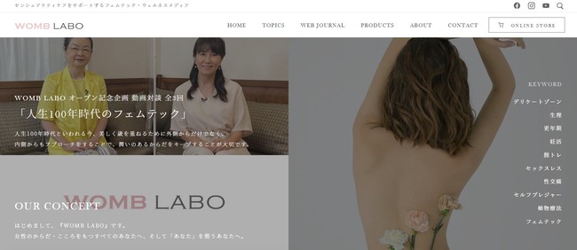 妊活から更年期ケアまで専門家による信頼性の高い記事が読めるメディアと、セレクトオンラインショップ「WOMB LABO ONLINE STORE」2つの軸で、自分自身のからだを知り、向き合うための知識や情報の発信を通じて「潤うからだ」づくりをサポートします。