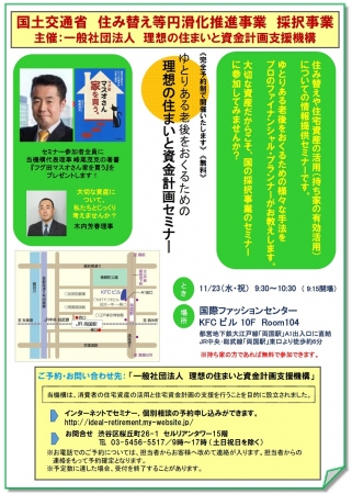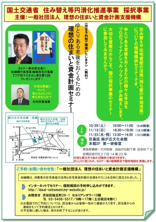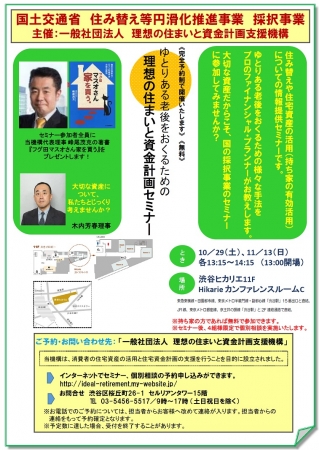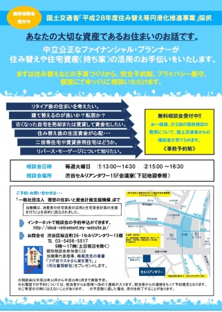 一般社団法人理想の住まいと資金計画支援機構(本社渋谷区:代表理事峰尾茂克)は国土交通省『平成28年度住み替え等円滑化推進事業』の採択を受け、高齢者や高齢の親に持つ子供等に対して、高齢者の住み替えや住宅資産の活用に関して国からの援助による無料セミナーや無料個別相談を開始した。