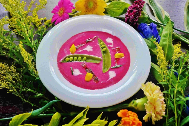 80度で3時間かけて蒸し煮した北海道産ビーツのスープ