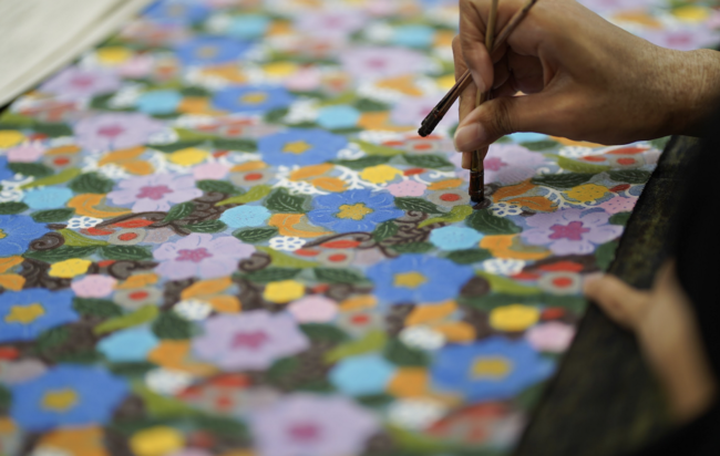 琉球びんがたは沖縄の豊かな自然や特色を鮮やかな色彩や図柄で表現した沖縄の最も代表的な伝統的手染物です。戦前までは琉球衣装として、戦後には和装として多く染められ戦前以上に全国へと広がっていきました。起源は15世紀ごろ、中国やインド、ジャワの更紗などの染色技術を基に琉球びんがたが生まれたとも言われています。薩摩侵攻、琉球処分、太平洋戦争などの影響により歴史の中で何度も消えかけ、その度に荒波を乗り越えて現在に繋いで歴史を紡いできました。琉球びんがたは沖縄の歴史そのものと言っても過言ではない沖縄の染物伝統工芸です。