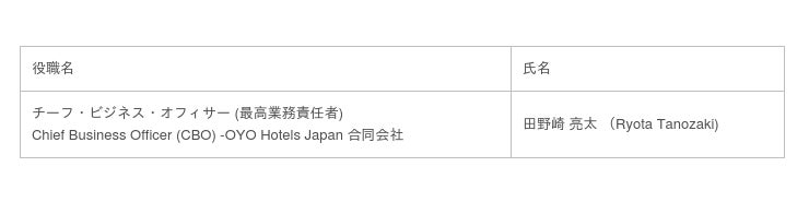 CBO就任に際して田野崎は次のように述べています。「OYO Hotelsが、テクノロジーを活用してホテル業界を変革するという点に大きな可能性を感じております。今、OYO Hotelsには情熱と高い柔軟性を兼ね備えた経営陣やチームメンバーが揃っています。自分にとって関係の深いホテル事業で、強力な仲間と一緒に成長性のあるOYOのビジネスを日本で推進していけることが非常に楽しみです。お客様やホテルのパートナー様、社員ひとりひとりに誠実に向き合って、価値のあるサービスを提供していきたいと考えております。」