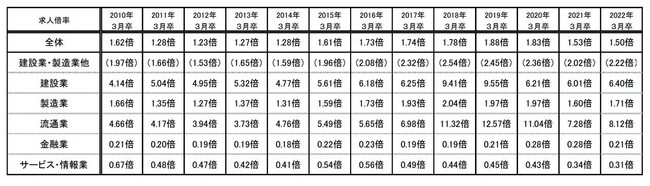 2020年の調査では、新卒採用の求人倍率が製造業に次いで2番目に低い倍率となり、全体平均の約4〜5倍の数値を記録しています(※右上図参照)