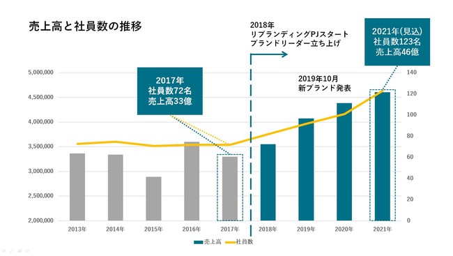 2018年の本社オフィスリニューアルに伴い、「リブランディング」を実施。独自の「働きがい創出」や「採用ブランディング」により、社員数を倍増させ、現在年間300人以上の求職者が訪れる企業に成長した。