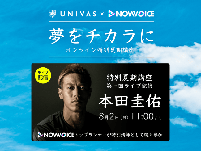 一般社団法人大学スポーツ協会(東京都千代田区、会長:鎌田薫、以下 UNIVAS) は、プレミアム音声サービス『NowVoice 』と連携し、新型コロナウイルスの影響でインカレの中止や延期が相次ぐ中でも活動を続ける運動部学生たちに向けて、特別夏期講座『夢をチカラに』を開催。『 NowVoice 』に参画するトップランナーが特別講師を務めていく予定で、 記念すべき第一回の特別講師には、日本を代表するトッププレイヤーであるサッカーの本田圭佑選手に決定。学生たちに熱いメッセージをお伝えいただきます。