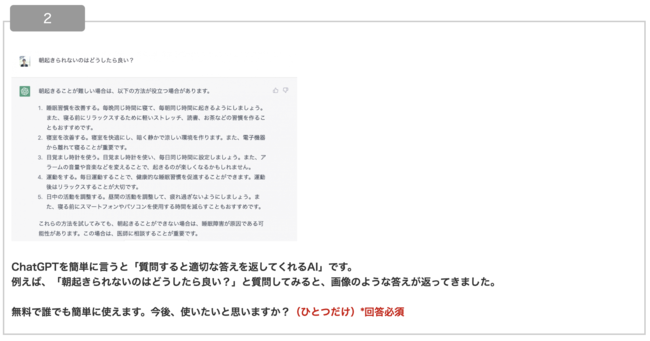 ChatGPTに関する簡単な説明をした上で、実際に「朝起きられないのはどうしたら良い?」という質問にChatGPTが回答している画像を見せたところ、「使いたい」「どちらかといえば使いたい」と答えた人が、合わせて40%ほどとなった。