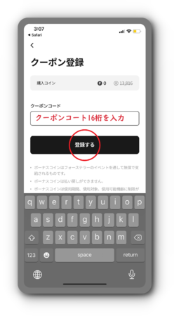 3. コピーしたクーポンコードを入力して「登録する」をタップ