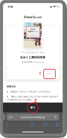 1. クーポンコード16桁をコピーした後 → 使うボタンをタップ