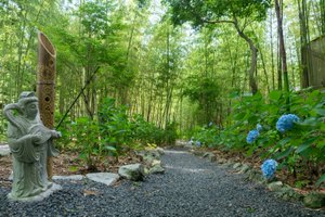 奈良偲の里 玉翠は、人里離れた奥熱川に佇みます。自然を眺めるだけでなく、その身を中に置くことができる、四季ごとに衣を変える和風庭園「葉ごろも(はごろも)」と、竹林の小径に囲まれております。竹林の小径がある竹の原生林と、けやきなどの大樹の森の中を改修し、竹林庭園「光だまり(ひだまり)」としました。大樹からの木漏れ日、竹あかりの光にちなみ、「光だまり」といたしました。大樹や竹以外にも、紫陽花、紅葉など、季節ごと様々な植物が根付いております。約200メートルの竹林の小径、木漏れ日テラス、四阿など、身を自然の中に置くことができるコンテンツを用意してございます。竹あかり、竹球など竹の工芸品を各所に設置しており、夜にはそれらがライトアップされます。昼には、せせらぎや笹の音を聴きながら木漏れ日を愉しみ、ライトアップされた夜には、また異なる世界をお愉しみいただけます。