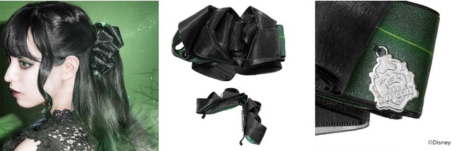 黒いサテンリボンに黒のオーガンジーリボンを重ね、優美で荘厳な雰囲気を演出。凛とした装いのブラックと知的なグリーンの配色が、優雅で品位あるスタイリングを叶えてくれます。サイドには寮をイメージした柄リボンと寮章チャームを使用し、ディアソムニア寮の世界観を表現しています。