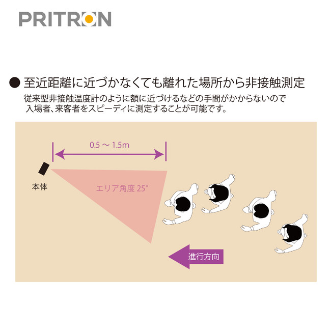 PRITRON PF-1500(S)は新型ウイルスのスクリーニング対策として開発された非接触温度計(体表面温度測定器)です。0.5m〜1.5m離れた場所から入場者を高速で連続検知、体表面温度測定、異常時にはブザーを鳴らすことが可能です。又非接触温度計のように人物が手動で作業を行う事も省略されます。