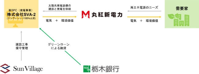 丸紅新電力株式会社(本社:東京都千代田区、以下「丸紅新電力」)と、株式会社サンヴィレッジ(本社:栃木県足利市、以下「サンヴィレッジ」)の100%子会社である株式会社SVA-2は、オフサイトPPAモデル(※1)による再エネ電気買取基本契約(以下、本契約)を締結しました。
