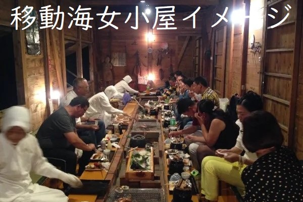 移動海女小屋「KABUKU丸では 海鮮中心のメニューからスペシャルBBQまで数種類のメニューをご用意します。販売価格は1名様 8,000円〜20,000円 2名様から予約可 完全予約制の予定ですが詳細はこれから決定します。