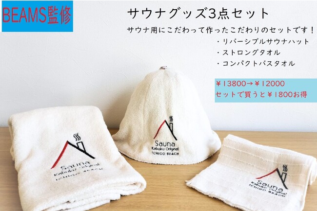 写真は、BEAMS JAPANと志摩市が共同で行った商品開発にKabuku Resortも参加して生まれたオリジナルサウナグッズシリーズです。2023年11月15日〜12月12日までBEAMS JAPAN新宿店とBEAMSオンラインで限定販売中です。BEAMSオンラインで 『志摩の恵み』もしくはKabuku Resortで検索