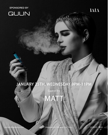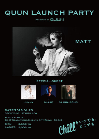 MattさんのQUUN公式アンバサダー就任を記念した、極上の音楽とチル体験ができるクラブイベントです。会場では、QUUNの人気フレーバーをお試しいただけます。また、Mattさんもゲストとして参加いただきます。その他人気のアーティストが出演。会場一体となってお楽しみ頂けます。
