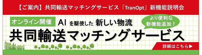 内容:(1)会社概要、 (2)共同輸送マッチングサービス「TranOpt」の概要および新機能の説明、(3)質疑応答