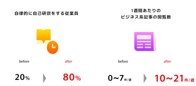 ・上司から見ても、部下が読んだ記事の内容について意見交換したり、読んだ記事のジャンルによって貸す本の種類をより今の課題や求めているものに合わせて貸せるようになった。