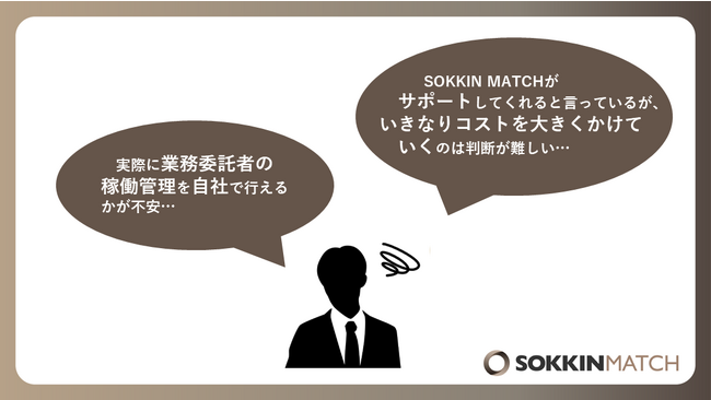 そのような懸念がある企業に対して当社SOKKIN MATCH事務局のサポートは勿論ですが、より気軽にコストリスクを抑え、優秀な業務委託者をお試しで活用出来るプランをご用意させて頂き、自社内での活用方法や対応オペレーションをより身近に体験出来るようにする事で、質の高いマーケティングを提供していくステップを踏めればと思いリリース致しました。