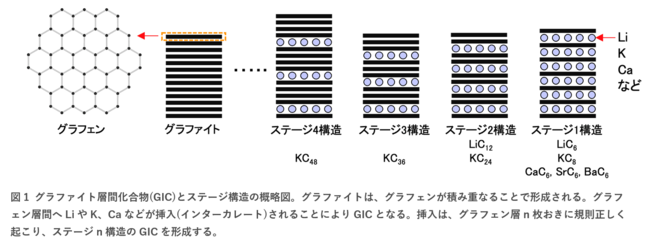 層間に入る原子の種類により多種のGICが存在し、それぞれが高導電性やガス吸蔵性、超伝導性など、多様な機能を有しています。グラファイトへのインターカレーション現象は、リチウムイオン二次電池の電極でも利用されています。最近では、GICを原料にしたグラフェン合成技術も開発され、今後もさまざまな応用が期待されます。しかし、気相法や溶融塩法などの従来のGIC合成手法は、合成プロセスが複雑で、合成に数日〜数週間を要し、ステージ構造(図1)の制御が容易ではなく、高価な高配向性グラファイト原料が必要など、高品質試料の大量合成には不向きでした。そのため、GICの実用化に向けて、革新的なGIC合成法の開発が望まれていました。