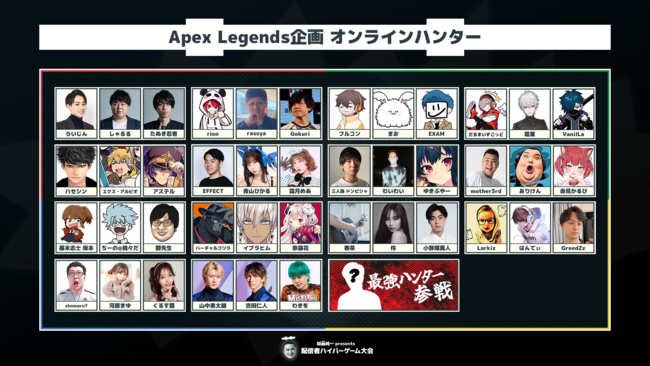 ハイパーゲーム大会メンバーの4チームとオンラインハンター15チームによる合計19パーティーでのカスタムマッチを実施。最強ハンターとして、チェアマンの加藤とプロプレイヤーのRasが参戦。
