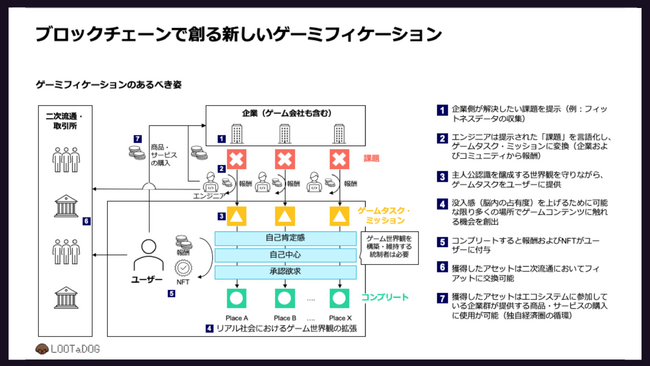 前半は「ゲーム社会と実体社会の関係性」や「ブロックチェーンを使ったゲーミフィケーション」について、後半は「LOOTaDOGで実装する具体的なゲーミフィケーション事例」についてご紹介させていただきました。