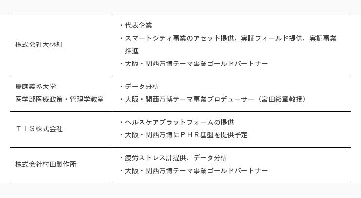 大林組は、慶應義塾大学(医学部医療政策・管理学教室 宮田裕章教授)、TIS株式会社(本社:東京都新宿区、社長:岡本安史)、株式会社村田製作所(本社:京都府長岡京市、社長:中島規巨)とコンソーシアムを組み、スマートシティ事業で開発した共益的なデータプラットフォームを提供することで、多くのサービス事業者と共創し、一人ひとりの多様な生き方と豊かなコミュニティ醸成を実現する、ウェルビーイングな社会づくりを目指します。