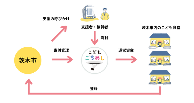 「茨木市こども食堂寄付サイト」は、市内で活動しているこども食堂の運営支援を目的として運営します。寄付金を集める窓口、各こども食堂へ運営資金を振込むシステムとして「こどもごちめし」を採用いただきました。