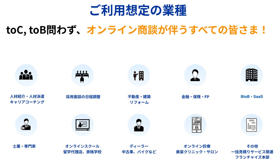 ご利用想定業種:人材紹介・人材派遣・キャリアコーチング・その他コーチング、カウンセリング/採用面談/不動産・建築・リフォーム/金融・保険・FP/BtoB・SaaS/士業・専門家/オンラインスクール・留学代理店・資格学校/ディーラー(中古車、バイク)など/オンライン診察・美容クリニック・サロン/一括見積もりサービス/フランチャイズ/その他