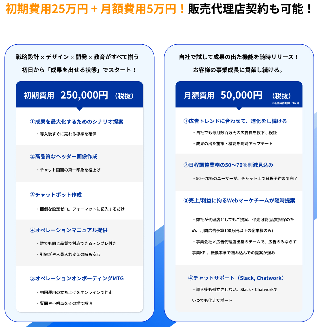 利用料金は初期費用25万円+月額5万円(税抜)からご利用いただけ、導入規模やご要望に応じた柔軟なプランをご用意しています。