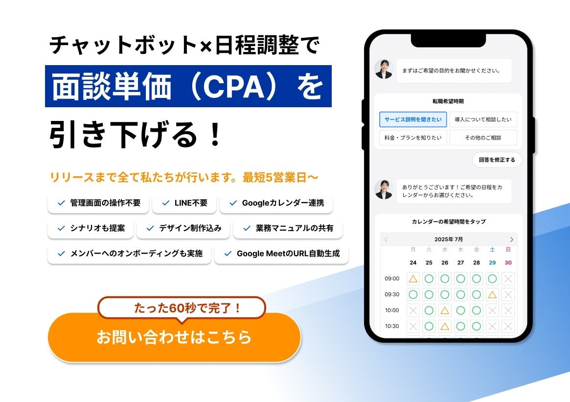 チャットボット×自動日程調整機能でアポ獲得を最大化!既存のLPに簡単に組み込めるサービスで面談単価(CPA)約1/2に改善実績あり!