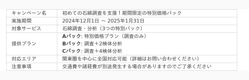 2024年12月1日から2025年1月31日までの期間中、石綿調査・分析をご依頼いただくお客様を対象に、特別価格で3つのパックをご提供いたします。お問い合わせやご依頼を希望される法人のお客様は、ぜひ当社までご連絡ください。価格や対応エリアの詳細については、当社の環境調査部までお気軽にお問い合わせください。
