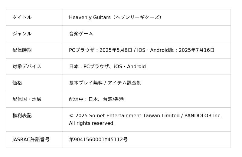 株式会社パンドラ(所在地:東京都渋谷区、代表取締役社長:森先一哲)は、エレキギターに特化した対戦型音楽ゲーム『Heavenly Guitars(ヘブンリーギターズ、以下本作)』におきまして、世界中で愛され続けている「残酷な天使のテーゼ」をギターカバー音源として、本作に収録したことをお知らせいたします。