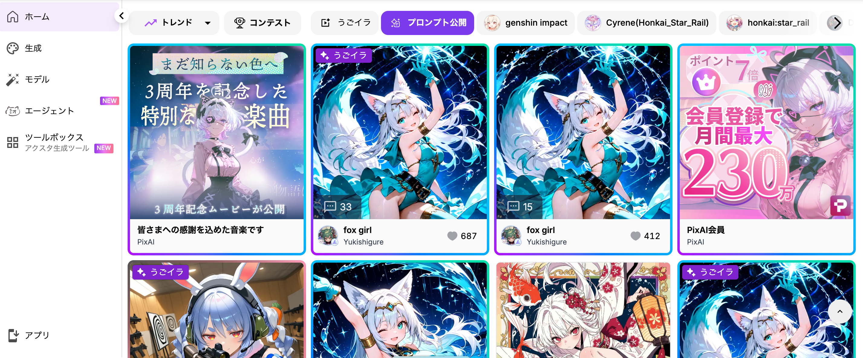 プロンプト公開をクリックするとクリエイターがプロンプトを公開している作品のみをフィードに一覧表示可能です。