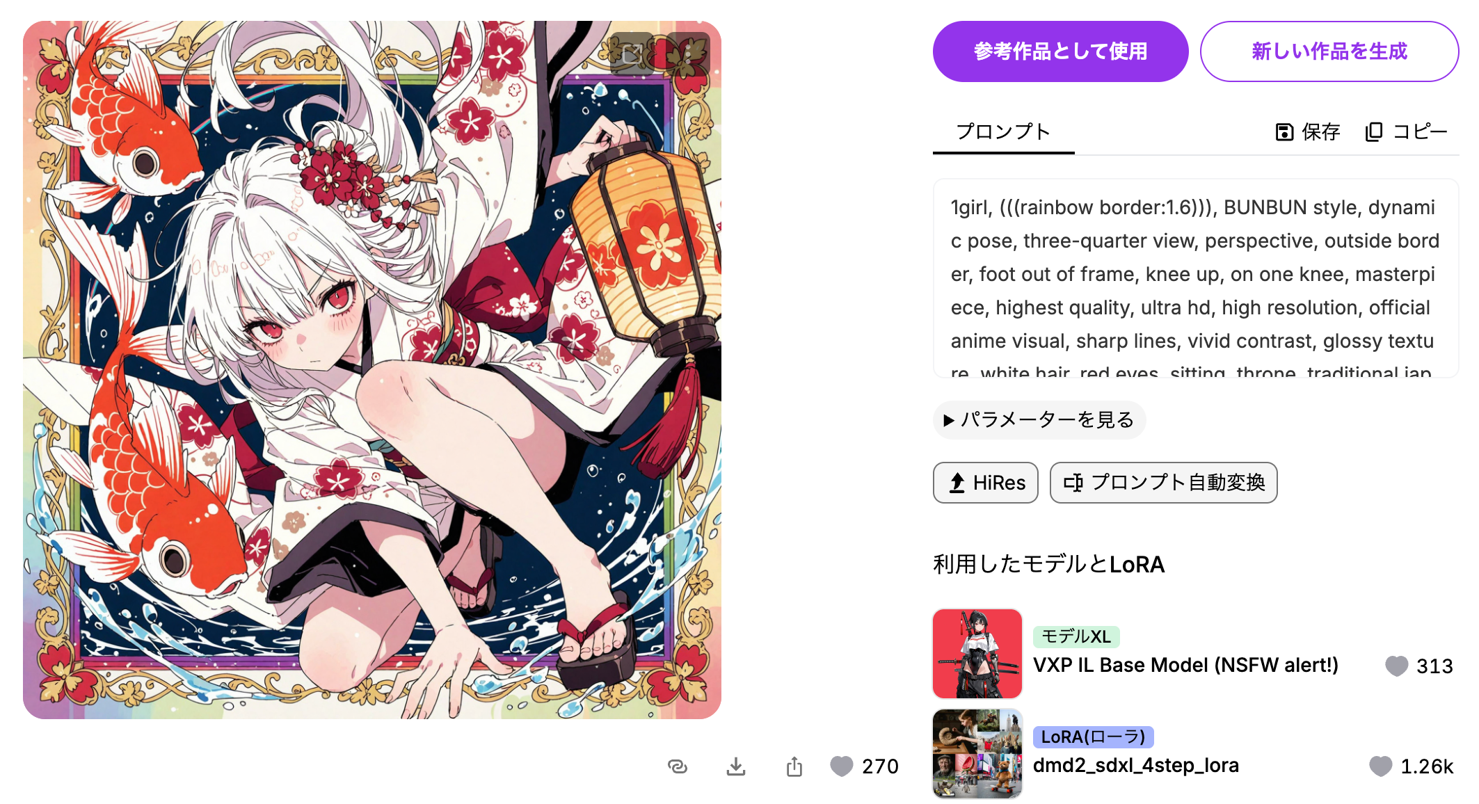 各イラストを開くとクリエイターが入力したプロンプト、使用した生成モデルとLoRAが公開されています。自分の好みのクリエイターのプロンプトを学ぶことができ、さらに画面上からはそのクリエイターのプロンプトおよび設定を流用して似たテイストや全く新しいイラストを生成することが可能です。是非お試しください。