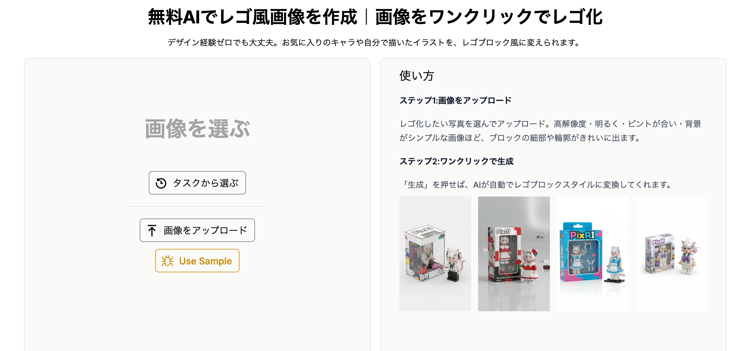 PixAI内で作成したイラストのレゴ化はもちろん、お手持ちの写真データ等をアップロードしてレゴ化することも可能です。是非いろんな楽しみ方を見つけてください。