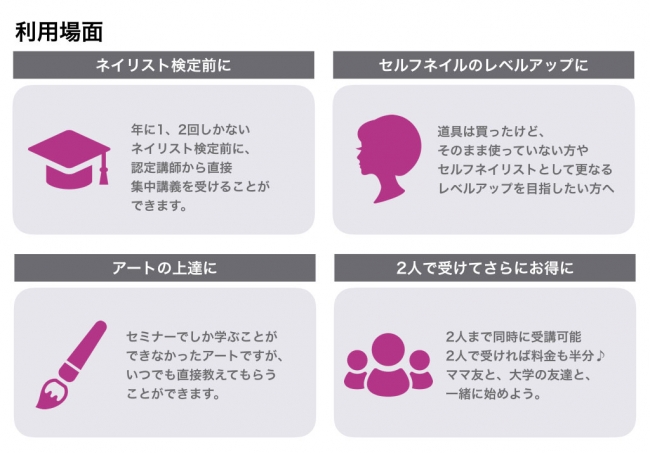 利用場面は主に以下の4つです。一番のポイントは趣味でネイルをやっている方も気軽に利用することができます。