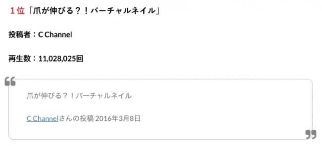 ハウツー動画メディアのC Channelにおいては、再生回数1位はネイルの動画であり、その再生回数は1,000万回を超えています。