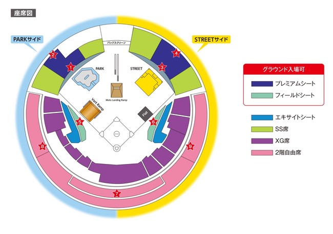 各種目の競技ステージ周辺まで行ってアスリートの迫力を間近に観戦できるグラウンド入場可の【プレミアムシート】【フィールドシート】、そして各種目の競技ステージ近くの指定席【SS席】【エキサイトシート】、会場全体を見渡すことができ大型ビジョンで各競技を逃さず観戦できる【XG席】、スタジアム全体を上から見渡せて、ご家族やグループでの観戦にオススメのリーズナブルな料金設定の【2階自由席】は、アクションスポーツに興味関心のある子供たちに世界トップクラスの技と興奮を体感してもらえるよう小中高校生料金(500円〜)を設定しています。