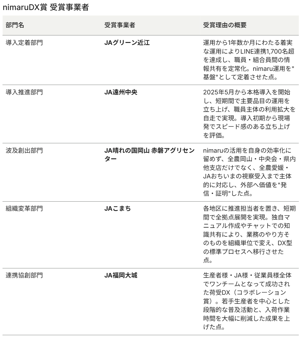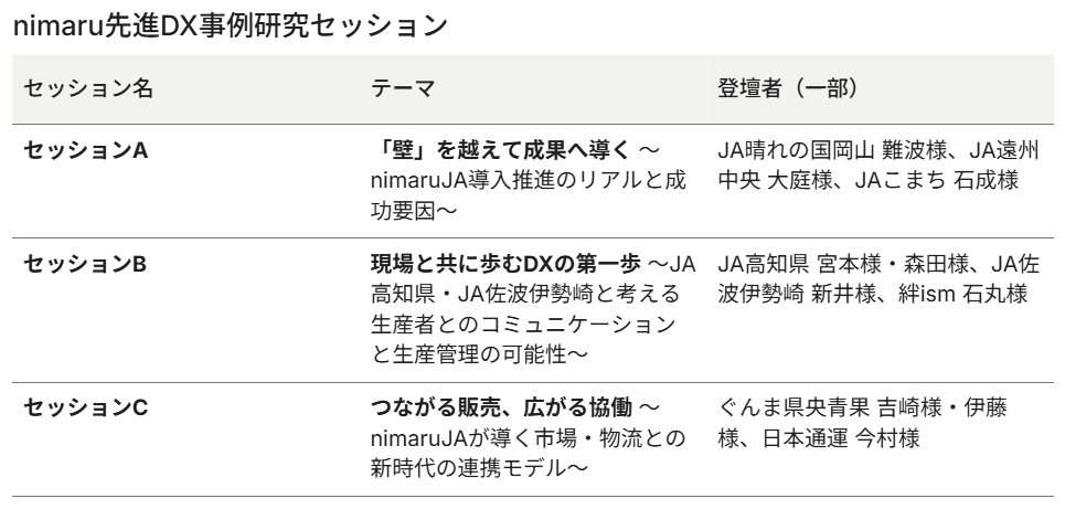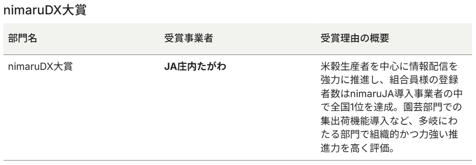 - 「これからの推進に活かせる内容でした。それぞれの特色やnimaruの活用の仕方があり、興味深かったです。」(県域組織・園芸推進担当、某単協組織・拠点担当課長)