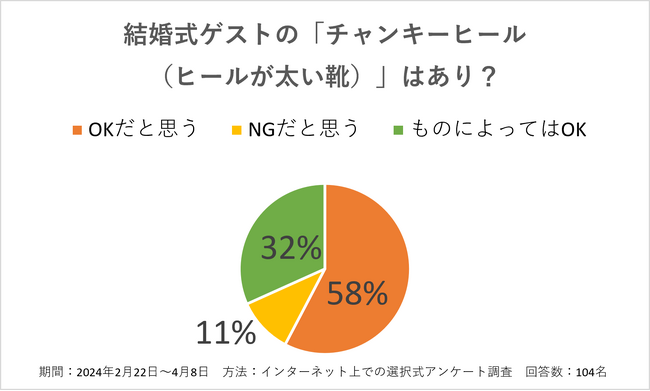 「ハーフアップはOK」とする回答が76%でした。チャンキーヒール(ヒールが太い靴)については、OKとする回答が約60%でした。これらのアイテムは、すでに結婚式ゲストのアイテムとして認識されていることが伺えました。