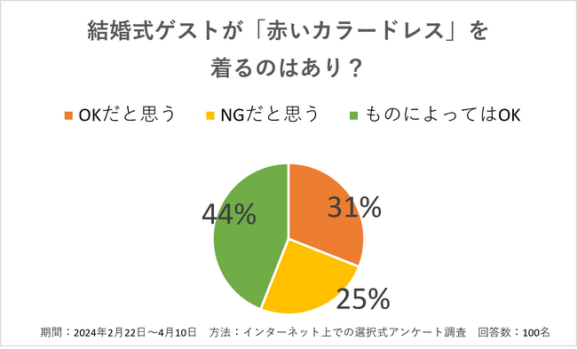 結婚式ゲストが「赤いカラードレス」を着るのはあり?と聞いたところ、OKとNGが3割と意見が分かれました。最も多かった回答が「ものによってはOK」で4割でした。これは赤いドレスという目立つドレスカラーに対して、「ゲストは花嫁を引き立てるドレスを着るべき」とする意見や「ドレスは個人の自由を尊重すべき」という考えが拮抗している現状がうかがえました。