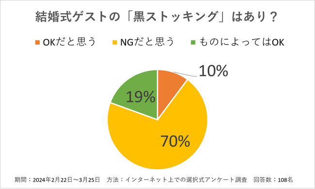 「黒ストッキング」や「オープントゥ(つま先のでる)パンプス」については、いずれもNGとする回答が7割でした。これらのアイテムは結婚式NGマナーとして定着している現状がうかがえました。黒ストッキングは「喪」を連想させるものとしてお祝いの席にふさわしくないとする意見がありました。「オープントゥ(つま先のでる)パンプス」はサンダルを連想させるカジュアルな装いとしての意見がみられました。