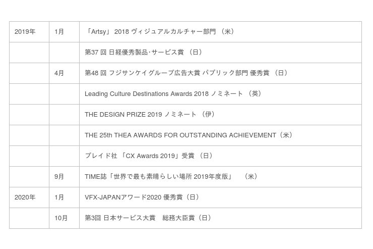 「栄誉ある賞を賜り、大変光栄に存じます。国際的デスティネーションとすべく、ここでしか得られない体験や、身体ごと没入するアート空間を追求して参りました。引き続き、首都・東京の磁力向上に貢献してまいります」
