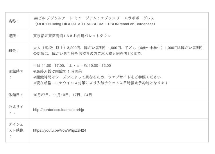 ご来館いただいた皆様に安心して楽しんでいただけるように、今後も最高レベルの環境整備に努めてまいります。具体的な対策は、公式ウェブサイトの特設ページ(https://covid-19.teamlab.art/borderlesstokyo/jp/)をご参照ください。