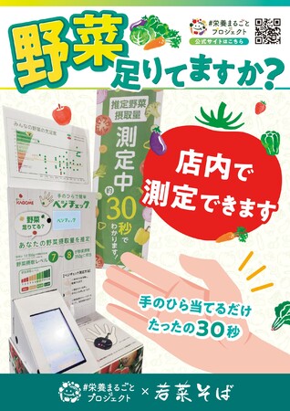 株式会社ランドリンク(所在地:東京都港区、代表取締役:蓮見知章、以下当社)が運営する、栄養不足問題・食品ロス問題の解決を目指し発足した「#栄養まるごとプロジェクト」は、株式会社平野屋(所在地:大阪府泉大津市、代表取締役:平野誠、以下「平野屋」)と、平野屋が運営する「若菜そば 阪急十三店」にて10月31日(月)〜11月14日(月)の期間限定で、野菜摂取量を計測できる「べジチェック」の設置及び、皮ごと野菜を使った新メニュー「べジそば」の販売をいたします。