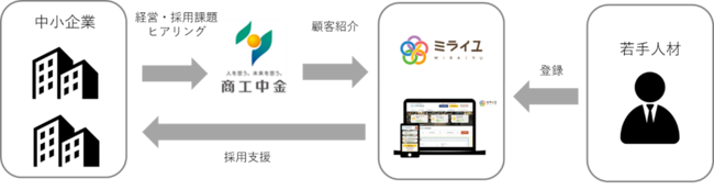 本業務提携では、商工中金の顧客企業の人材・採用課題に対し、ミライユの採用支援サービスにより人材・人手不足の解消をサポートします。採用にお困りの企業一社一社に焦点をあてた採用支援に取り組むことで、企業成長にむけた一歩踏み込んだ事業支援を行います。