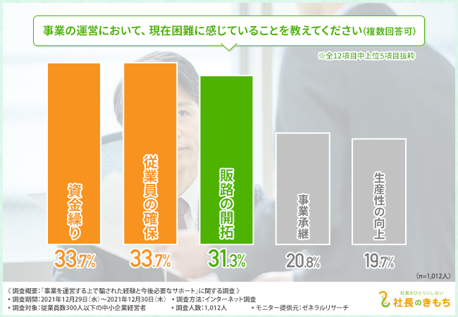 「事業の運営において、現在困難に感じていることを教えてください(複数回答可)」と質問したところ、『資金繰り(33.7%)』『従業員の確保(33.7%)』という回答が同率で最多となり、以降『販路の開拓(31.3%)』『事業承継(20.8%)』『生産性の向上(19.7%)』『事業の再構築(16.9%)』と続きました。